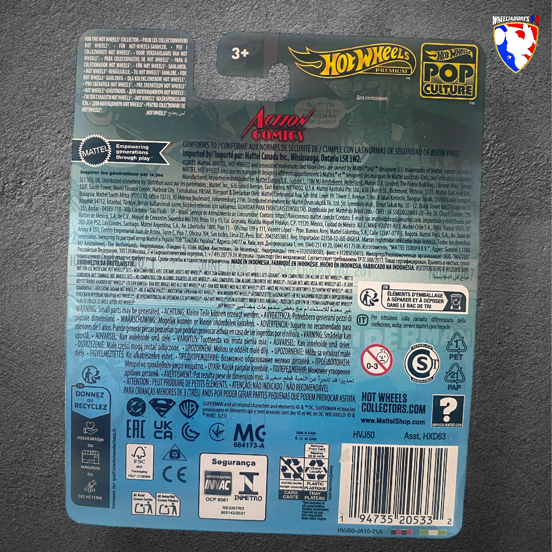 Carrito de colección diecast en escala 1:64, sedán tipo berline con acabado metálico inspirado en un icónico cómic de superhéroes. Detalles vibrantes que recuerdan a los héroes más famosos, ideal para exhibir o agregar a tu colección.
